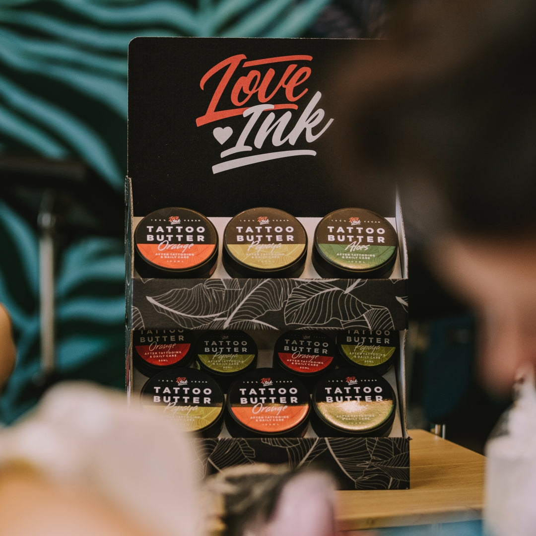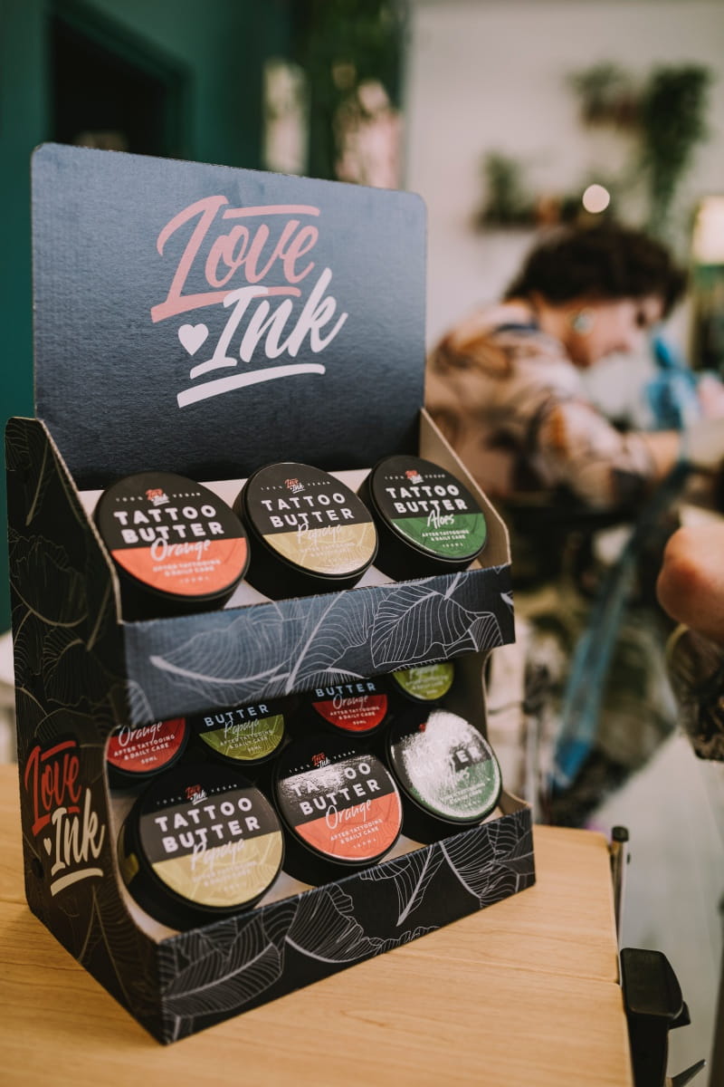 Kartonsko stojalo LOVEINK vam bo omogočilo estetsko predstavitev izdelkov v vašem studiu za tetoviranje ali trgovini.